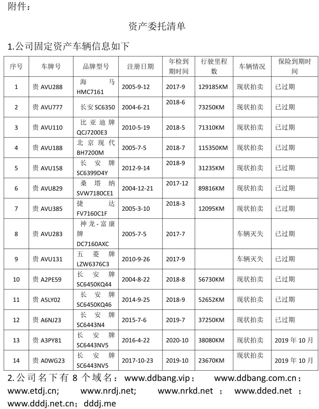 该公司名下的附带资产包括汽车14辆及8个域名,详见附件(资产委托清单)。